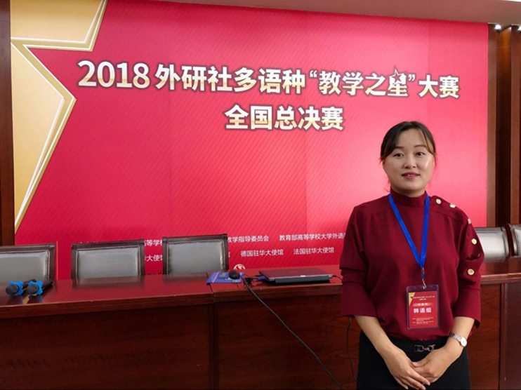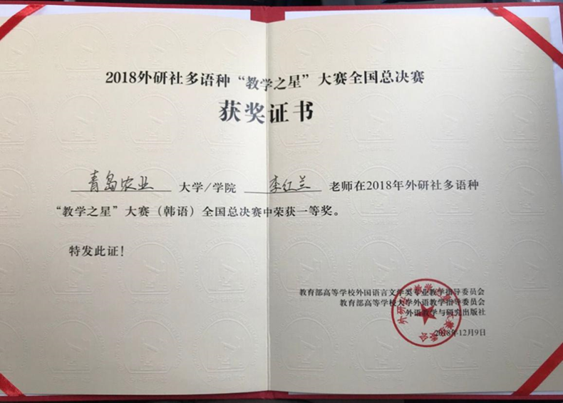 2018外研社多语种“教学之星”大赛历时9个月,通过初赛院校选拔推荐,来自全国近150所院校300余名教师成功进入全国复赛,经过激烈角逐,最终8个语种的108名参赛教师晋级全国总决赛。在总决赛中,李红兰老师作为青岛地区唯一代表选手,与来自全国各地的韩语组选手进行同台比拼,最终荣获全国总决赛一等奖。