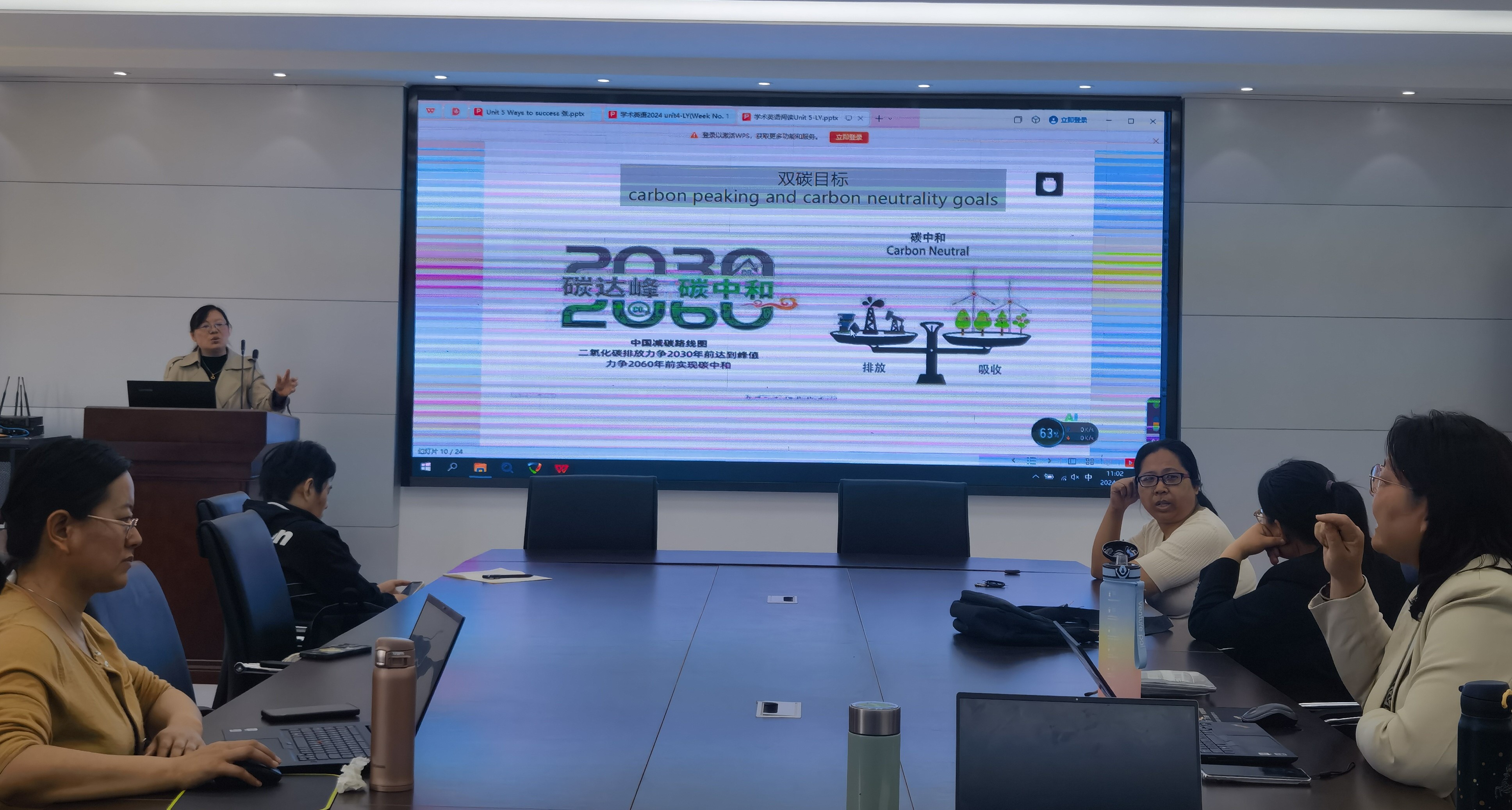 赖艳老师对《学术英语》第五单元的教学设计进行了说课。老师们积极讨论了其中碳中和、碳达峰等知识点的授课思路,对课程的时代性进行了点评和讨论。