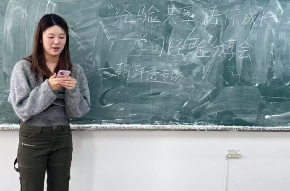 在朝鲜语学习经验交流会上,周子珍首先为大一学生介绍基础韩国语知识框架,剖析学习重点难点;接着又面向大二大三学生分享韩国语高阶学习方法、中韩互译技巧等,解决专业学习中的实际问题。