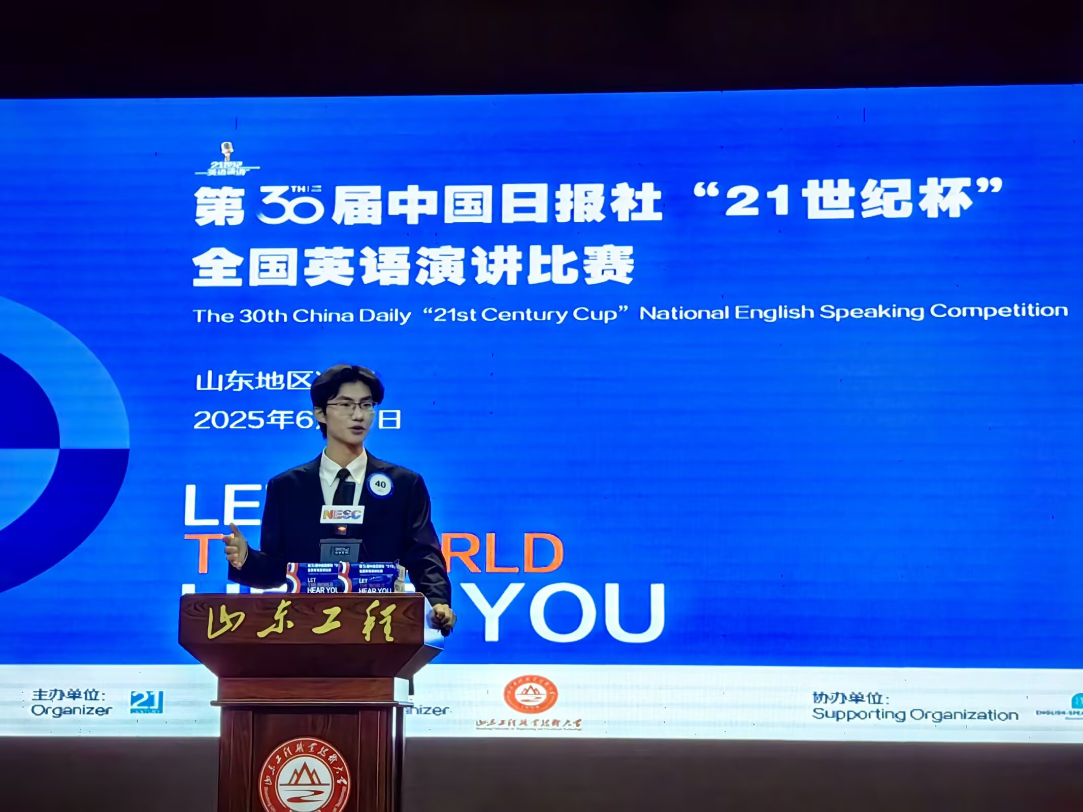 6月20日至21日,第30届中国日报社“21世纪杯”全国英语演讲比赛山东地区决赛在山东工程职业技术大学落下帷幕。由williamhill体育在线登录英语系教师夏鹏铮指导的唐晨亮(巴瑟斯学院)、陈悦琳两位同学,通过有备演讲、即兴演讲、评委提问三个环节的激烈角逐,分别获得山东省二、三等奖的好成绩。