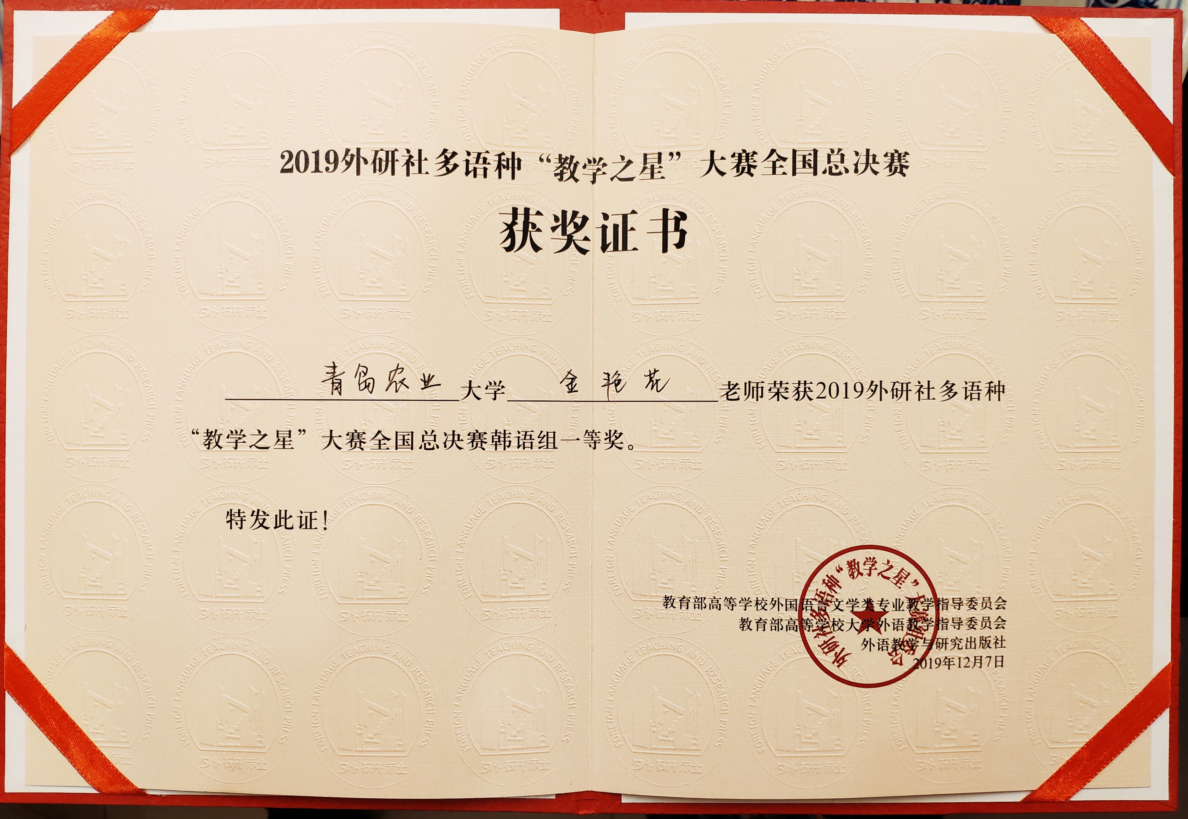12月7日,2019年外研社多语种“教学之星”大赛全国总决赛在北京落下帷幕,williamhill体育在线登录教师金艳花荣获韩语组一等奖。