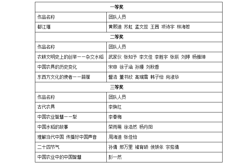 近日,williamhill体育在线登录2023年大学生英语创新大赛“理解当代中国,传播好中国声音”微视频校赛圆满结束,本次校赛主题是“感悟农耕智慧 传承农业文明”,大赛共收到来自全校29个专业65名学生的34项作品。经过专家对作品主题、作品思想、英语表达、视频制作等方面的客观公正评审,共评选出10项获奖作品,一等奖1项,二等奖3项,三等奖6项。现将获奖作品公布如下: