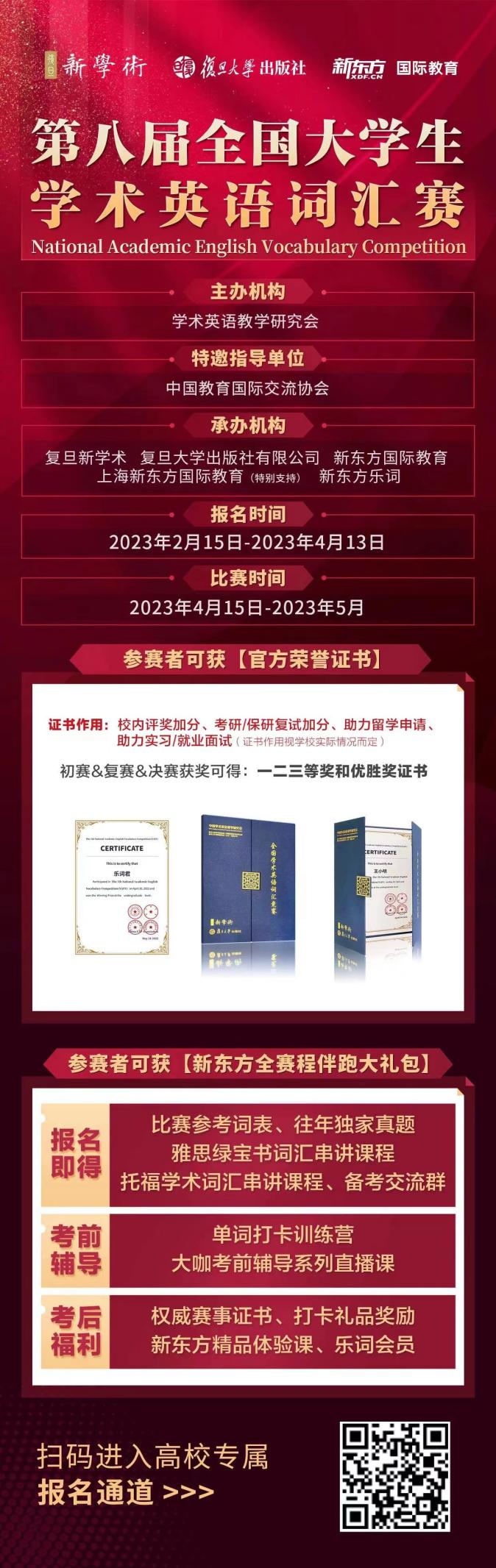 (3)进入决赛选手有机会获得“学术英语词汇之星”特等奖证书以及相应奖品。