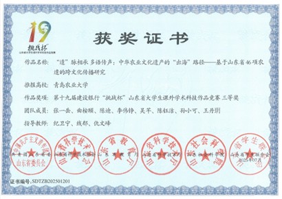 “挑战杯”竞赛作为大学生关注度最高的全国性赛事之一,被誉为中国大学生创新创业的“奥林匹克”。在本届山东省赛中,williamhill体育在线登录学生团队项目《“遗”脉相承 多语传声:中华农业文化遗产的“出海”路径——基于山东省46项农遗的跨文化传播研究》,荣获省级三等奖。该项目充分结合外语专业优势,展现出了较强的创新能力和跨学科研究水平。