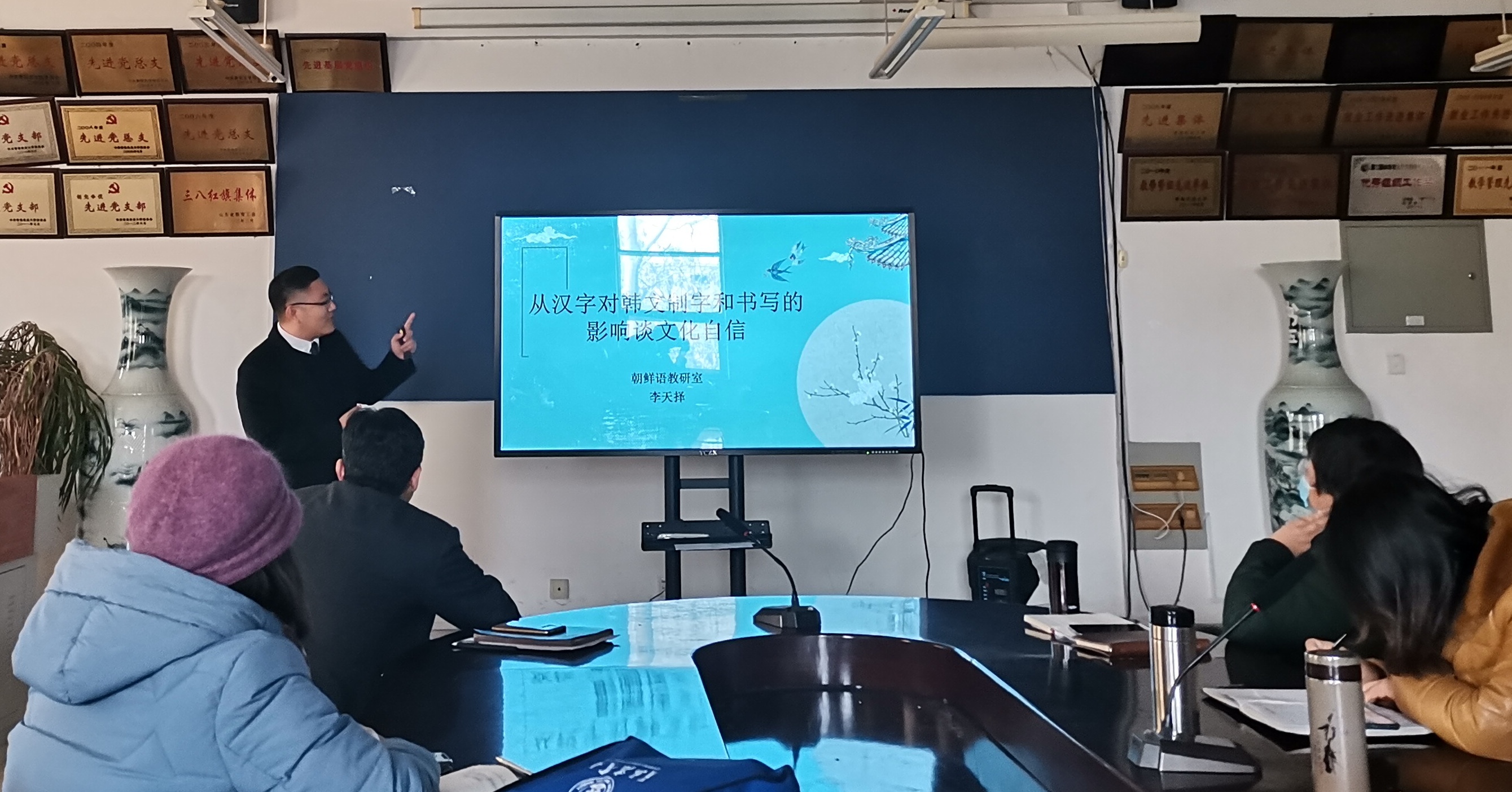 12月17日,williamhill体育在线登录于文经楼会议室开展外语学术论坛第十六讲。此次学术论坛由毕业于韩国高丽大学的李天择博士主讲,主讲题目为《从汉字对韩文制字和书写的影响谈文化自信》,学院全体领导、教职工与会,副院长高秀雪教授主持论坛。