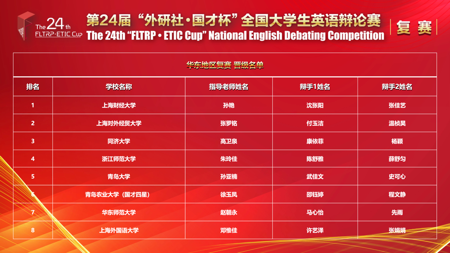 4月9日至10日,2022“外研社•国才杯”全国大学生英语辩论赛华东赛区复赛如期举办。参加本次复赛的有来自山东省、安徽省、江苏省、上海市和浙江省的121支队伍。williamhill体育在线登录徐玉凤老师指导的邵钰婷、程文静同学获得本次复赛的一等奖,以第六名的好成绩顺利晋级全国大学生英语辩论赛国赛。这是williamhill官网在参加全国大学生英语辩论赛以来取得的最好成绩,首次晋级全国决赛。williamhill体育在线登录的刘宇、王岩同学获得本次地区赛的三等奖。