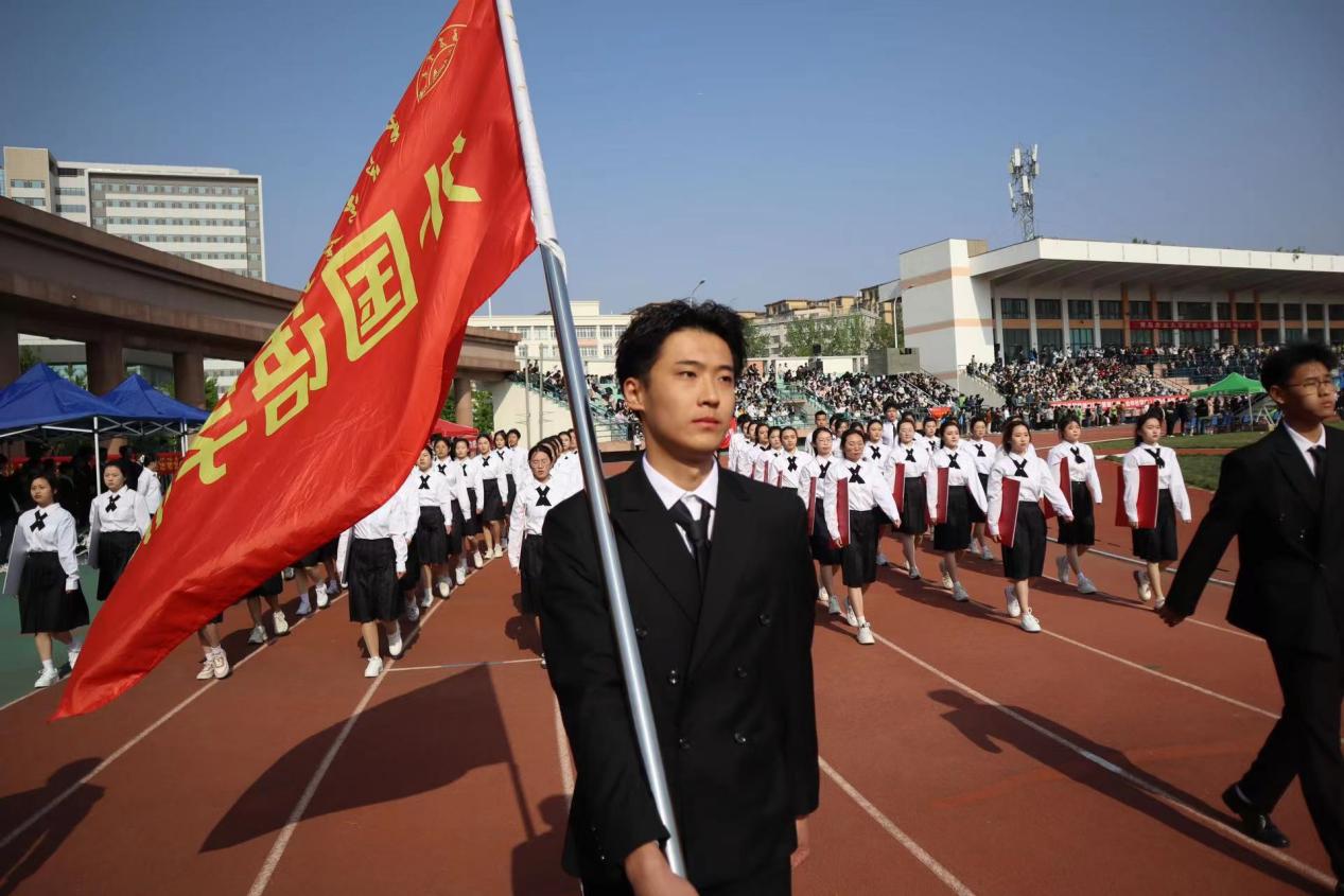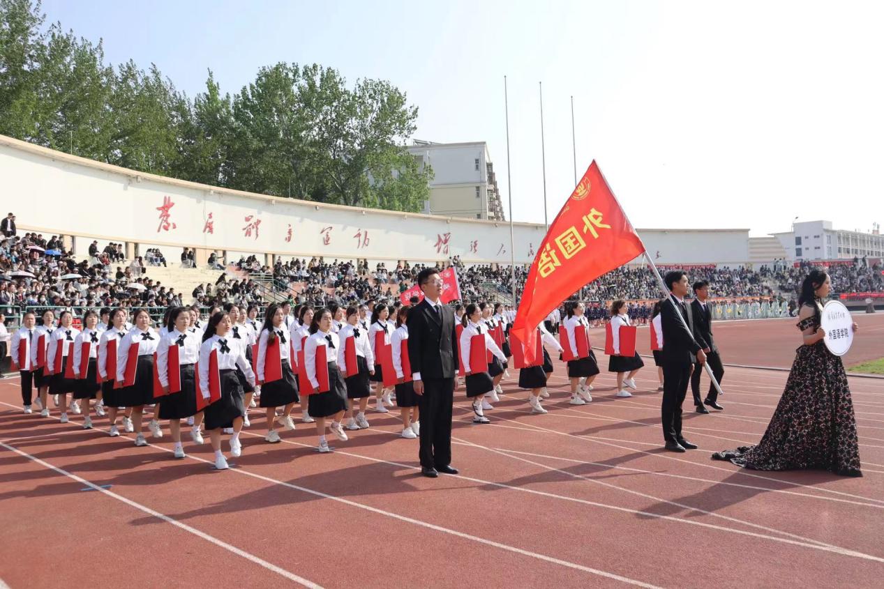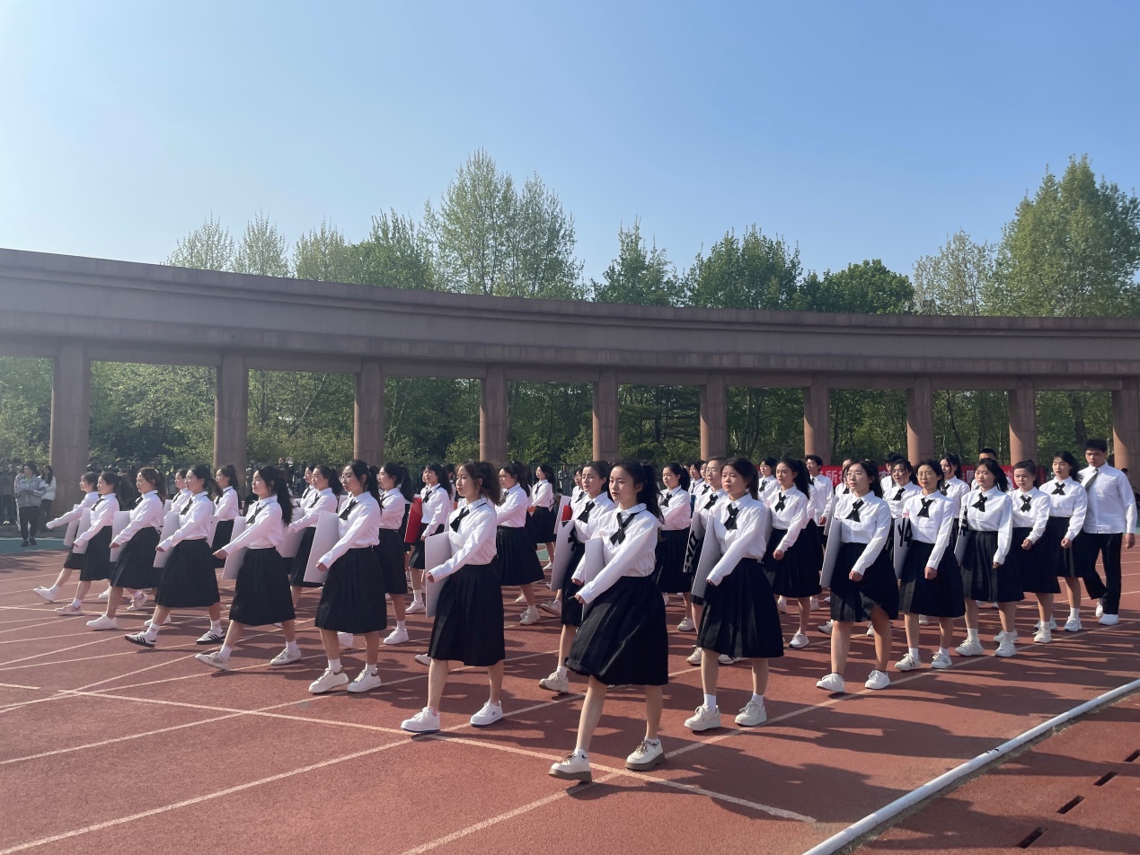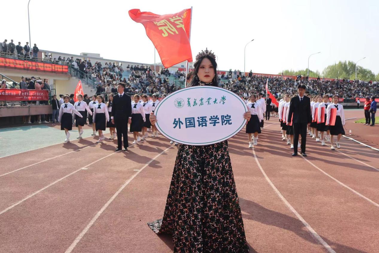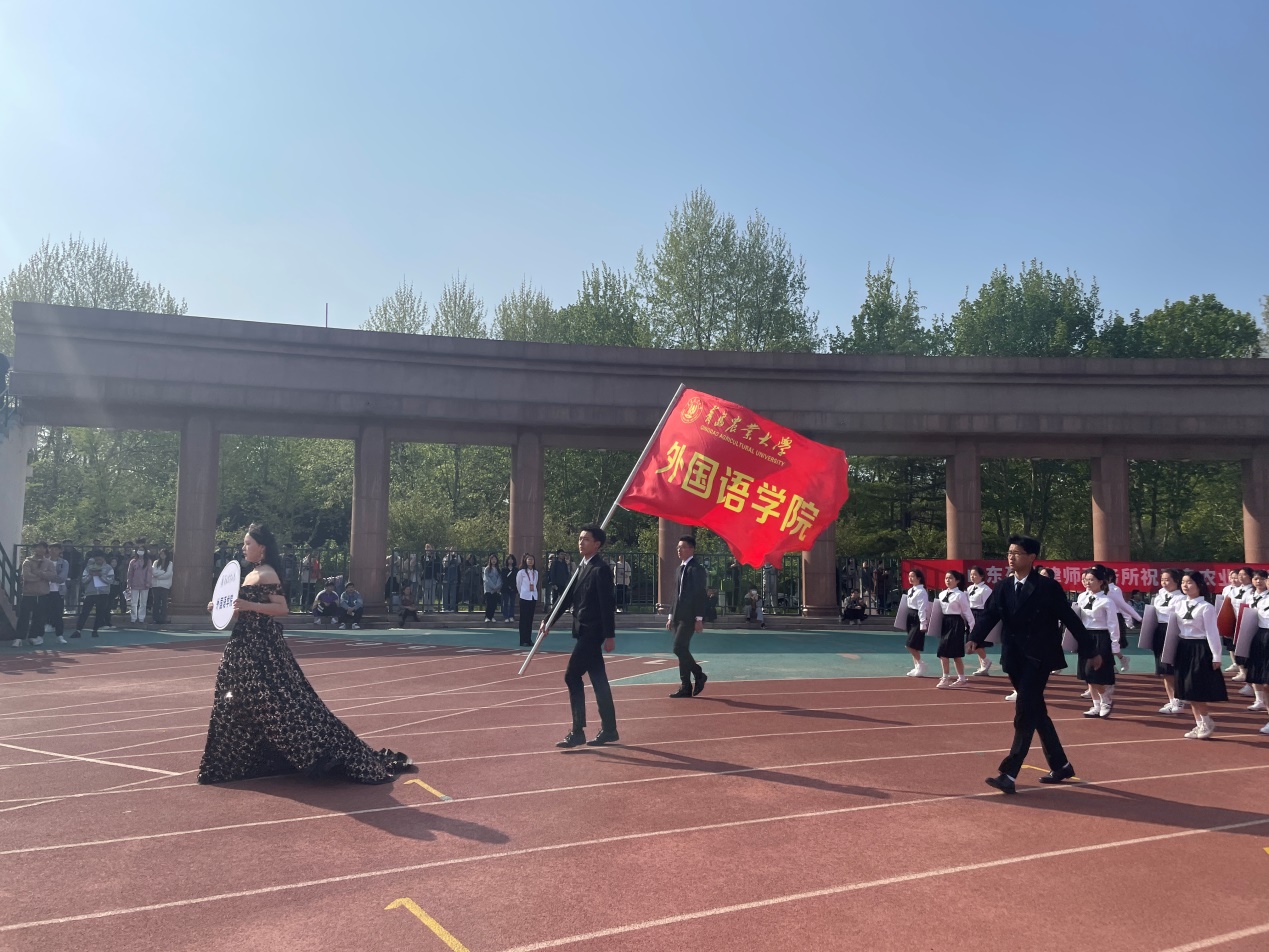 开幕式上,williamhill体育在线登录学生代表方队大放异彩。方队行进间,身穿黑白相间学院风制服的学子们步伐整齐,精神昂扬,展现出学院青春向上的良好风貌。期间,“奋勇拼搏 逐梦中华”的嘹亮口号彰显了外院学子一心向党、与祖国发展同频共振的情怀。在行至主席台前时,方队随着音乐节奏进行队形变换,用纸板拼凑起的“I LOVE QAU”字样令人眼前一亮;随之喊出的“博外之长,共语辉煌,青春无畏,外语飞扬”的口号,更是学院学子立志用外语讲好中国故事,传播好中国声音的最佳写照。