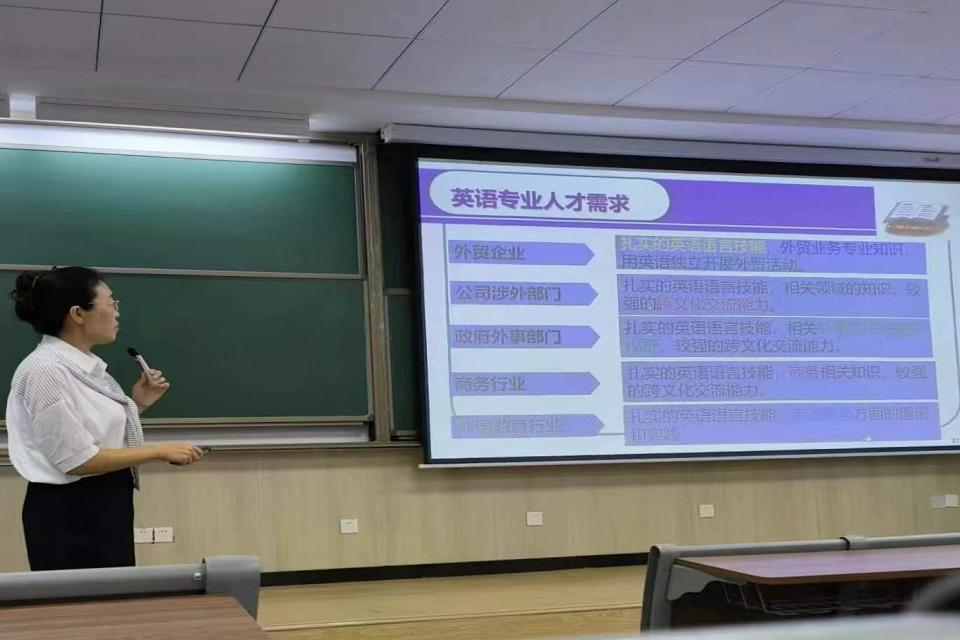 徐玉凤围绕英语专业概况、英语专业人才培养定位及目标、英语培养方案和课程设置介绍、培养过程、学生发展等方面进行讲解。她强调,同学们要多读、多听、多说、多写,培养专业兴趣,打牢基础,珍惜大学时光。
