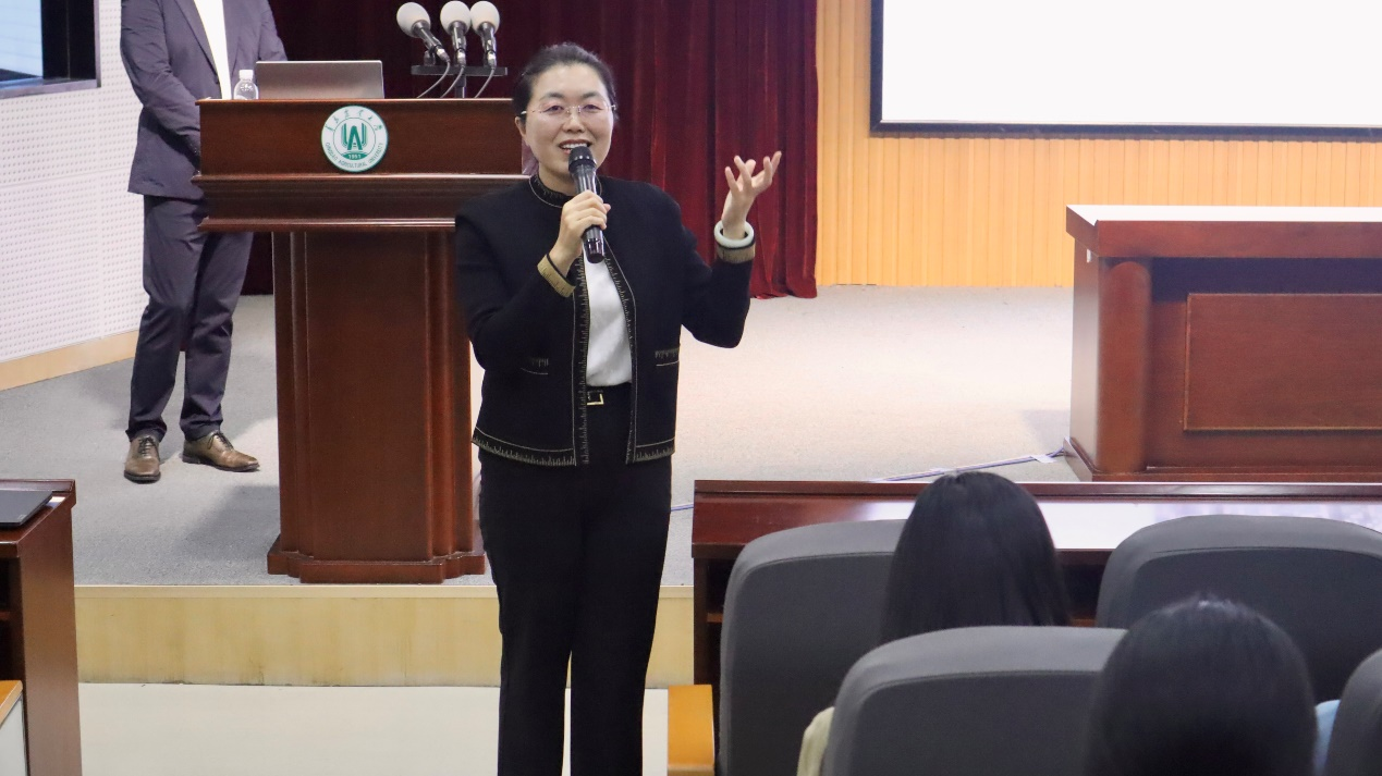 活动伊始,盛金玉为山东邦明集团董事长张君颁发聘书,聘任其为williamhill体育在线登录企业导师,盛金玉对张君表示感谢,希望进一步加强沟通交流,助力williamhill体育在线登录的高质量发展。张君以《解锁国际贸易,谋划职业精彩未来》为题进行分享,围绕外贸背景,邦明与农大,从事外贸必备素质,外贸公司类别,外贸人才标准,实习与就业准备六个方面具体讲述,强调了学院学生从事外贸工作的优势以及外贸行业的基本要求。随后,张君还就外贸事业与就业问题与同学深入交流,答疑解惑。郭畅为同学们讲解了秋招的重要信息,助力学院学生职业发展。