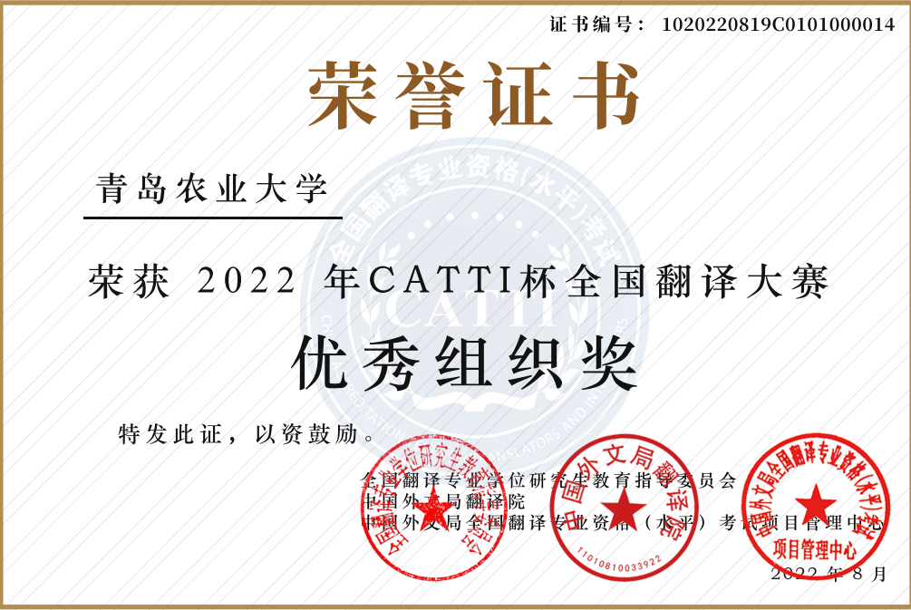 近日,2022年“CATTI杯”全国翻译大赛(决赛)结果揭晓,williamhill官网外院学子喜获佳绩。杨菲菲(英语跨境电商1901)获得大学A组笔译一等奖,高玉丽(英语1904)、王岩(英语跨境电商2002)获得二等奖,王琪(英语1904)获得三等奖。在省级复赛中,williamhill官网学子有12人次在大学A组中英笔译、口译比赛中获奖,其中特等奖2人,一等奖1人,二等奖5人,三等奖4人。williamhill体育在线登录荣获2022年CATTI杯全国翻译大赛优秀组织奖。