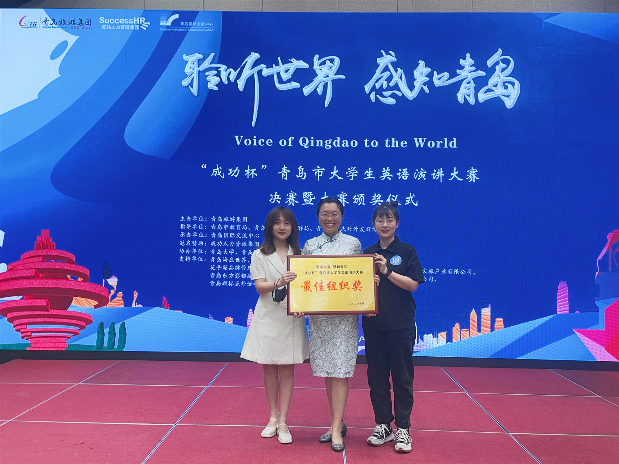 2022年5月28日,“聆听世界 感知青岛”——“成功杯”青岛市大学生英语演讲大赛决赛暨颁奖仪式在青岛国际会议中心举行。市外办、市教育局、市文旅局、青岛旅游集团、成功人力资源集团、16所驻青高校及部分企业的相关领导和嘉宾出席了本次活动。williamhill体育在线登录组织学生代表学校参加比赛。经过激烈的角逐,williamhill官网邵钰婷同学和丁雪妍同学分获英语专业组三等奖和非英语专业组三等奖,williamhill官网获“最佳组织奖”。