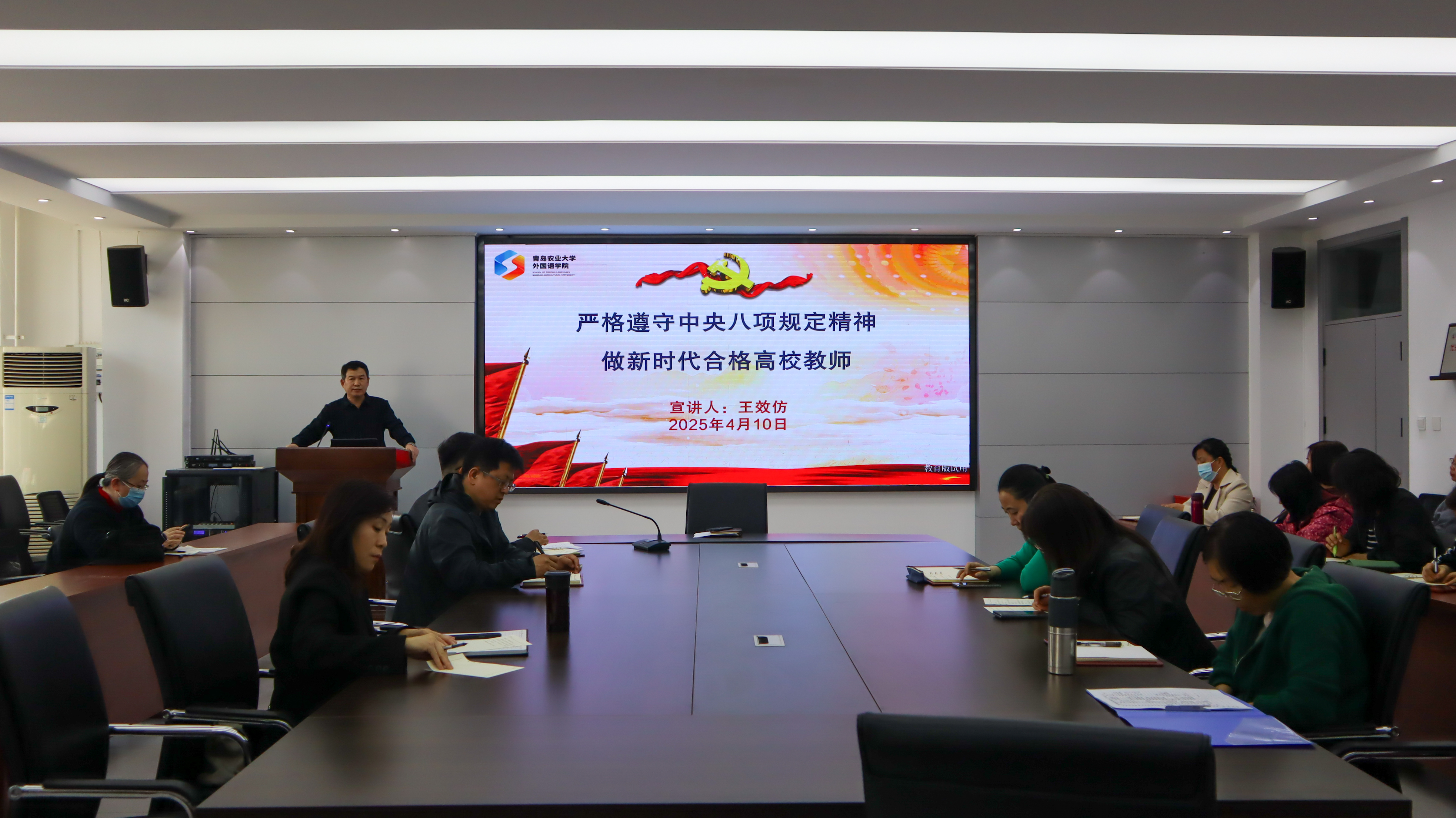 授课过程中,王效仿传达了深入贯彻中央八项规定精神学习教育工作的要求,并带领大家共同学习了中央八项规定、中央八项规定实施细则、中央八项规定精神等重要内容,结合学校及学院实际对中央八项规定精神进行了政策解读,列举了高校教师可能违反中央八项规定精神的11个方面的问题。王效仿要求,作为新时代的高校教师,必须始终严格遵守中央八项规定精神,切实加强作风建设,坚决杜绝任何形式的违规违纪行为,以实际行动践行新时代高校教师的职业使命与责任担当。