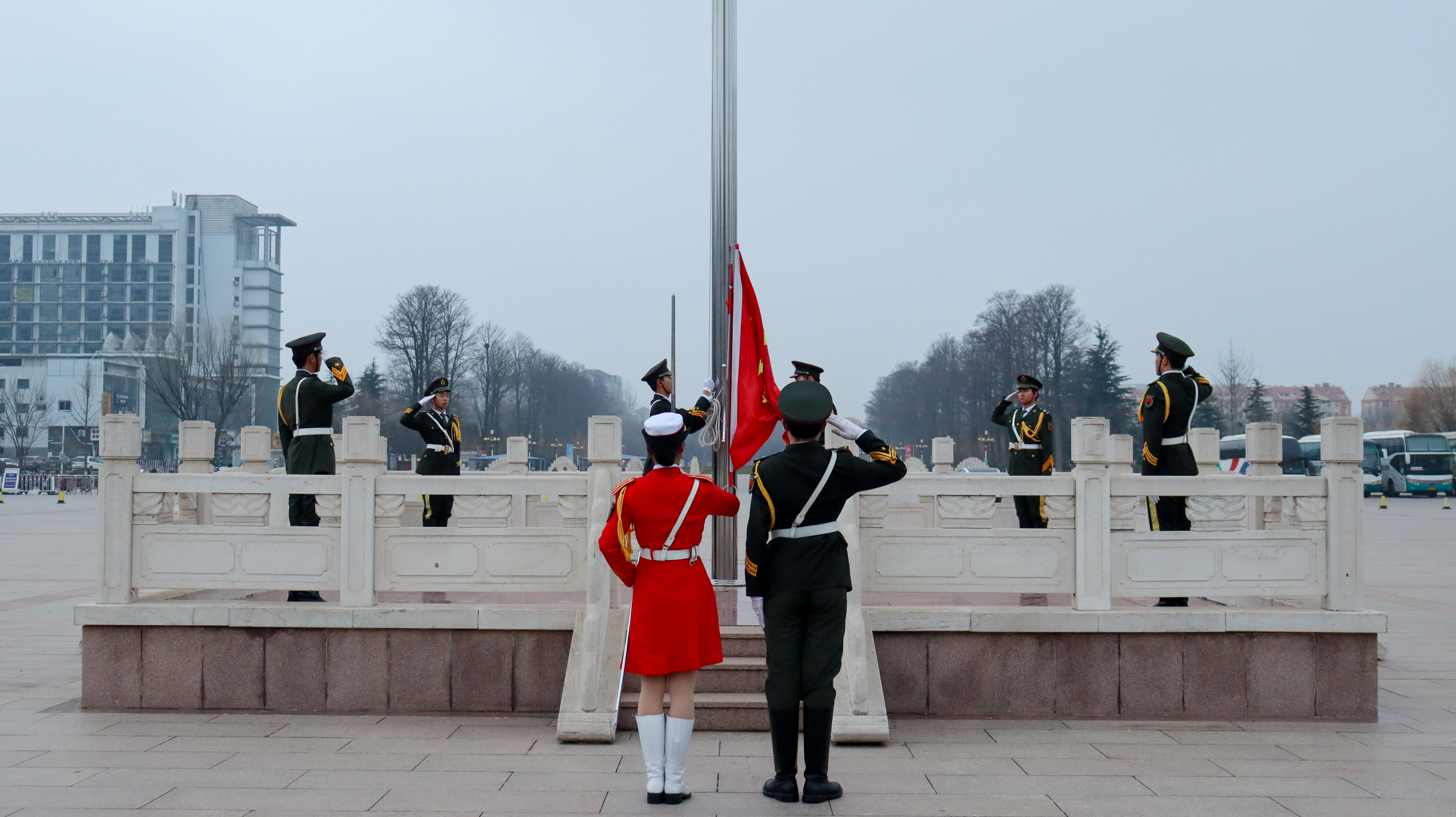 在激昂的进行曲中,国旗护卫队迈着整齐有力的步伐护送国旗入场。随后,升国旗仪式正式开始,在庄严的国歌声中,五星红旗缓缓升起,全体师生肃立,向国旗行注目礼,现场气氛庄严肃穆。